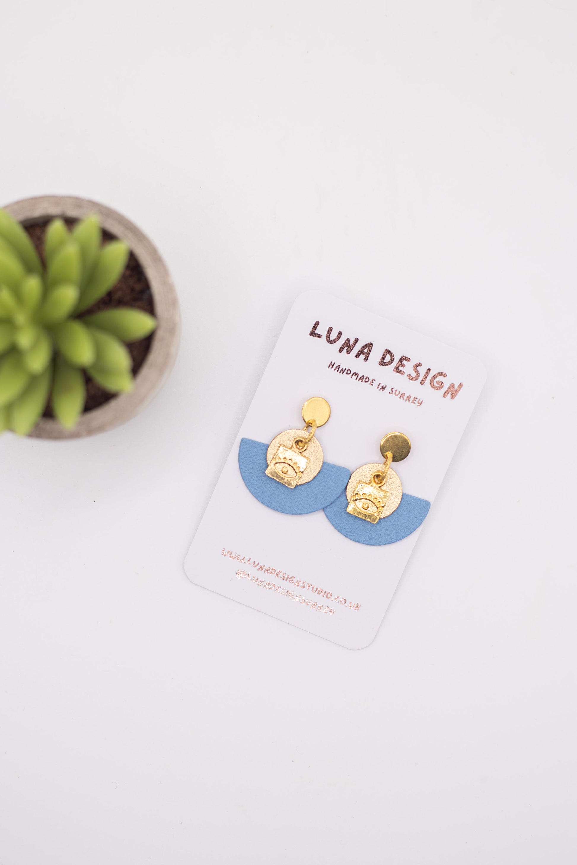 Make a statement with these bold leather earrings, featuring gold-plated evil eye charms for a touch of mystical charm. Lightweight and comfortable, the half-moon leather shapes hang from hypoallergenic gold plated studs. Handmade in Surrey and gift-ready in recyclable packaging, they’re the perfect addition to any outfit or a thoughtful present.