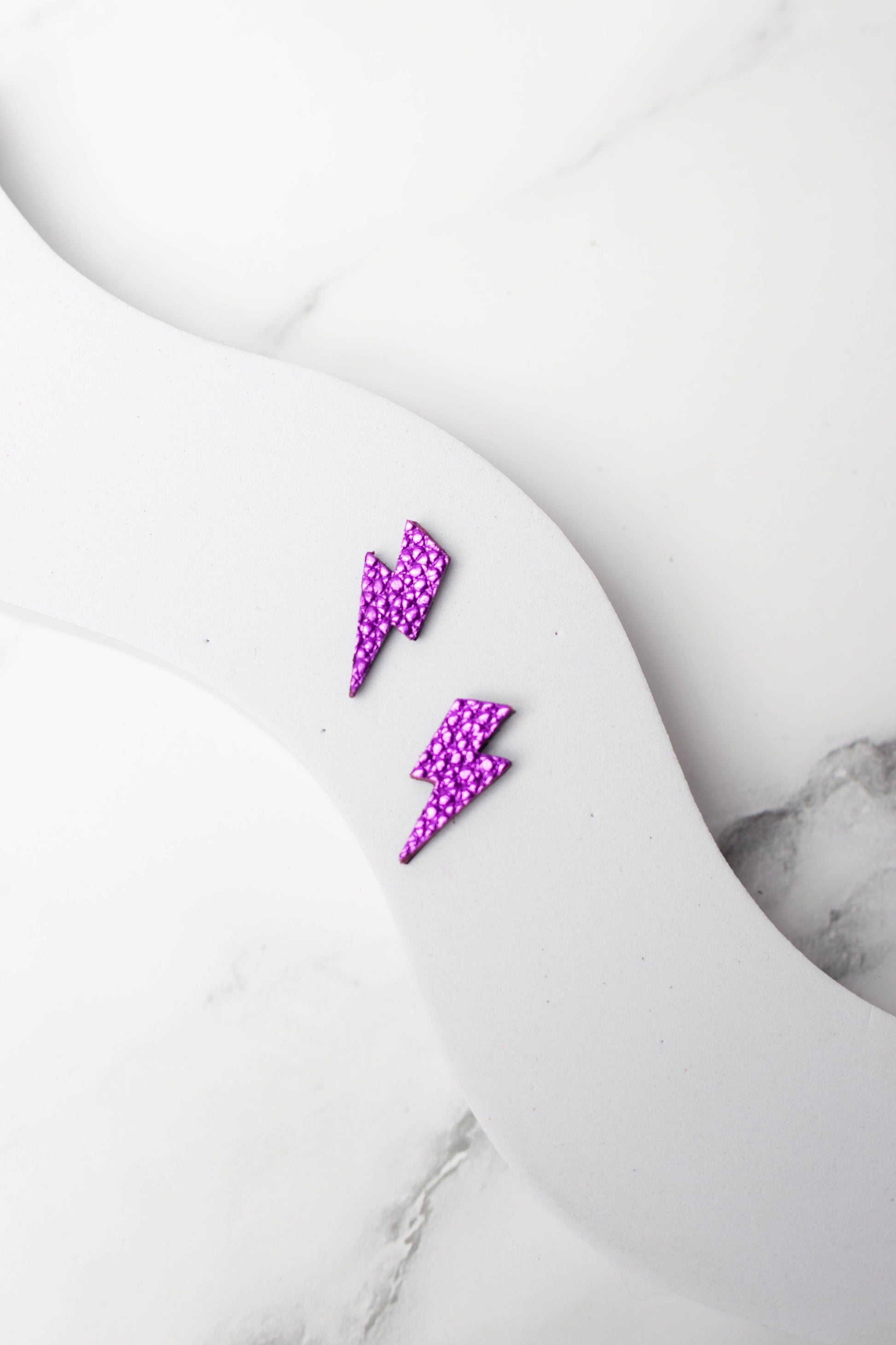 These purple lightning bolt studs add a subtle yet playful twist to your everyday outfits. Made from high-quality leatherwith a wood backing, they are 1 cm wide × 2.5 cm long, and feature hypoallergenic surgical steel posts with butterfly backs for maximum comfort. Handmade in Surrey, these lightweight earrings are perfect for stacking or wearing solo for a pop of colour and style.