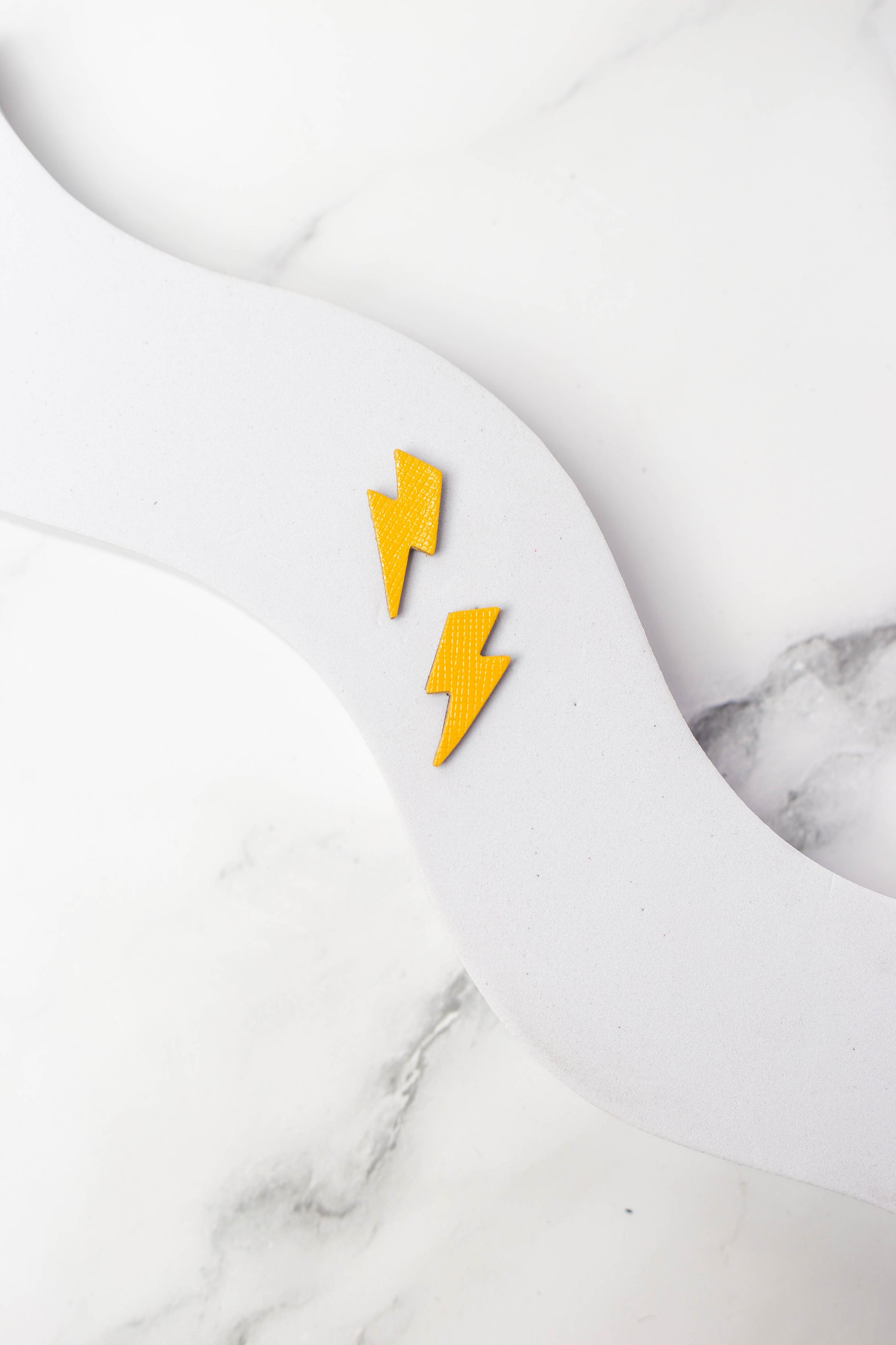 Bring a sunny, playful energy to your look with these yellow lightning bolt studs. Made from high-quality leather with a natural wood backing, each stud measures 1 cm wide × 2.5 cm long and features hypoallergenic surgical steel posts with butterfly backs for comfortable, all-day wear. Handmade in Surrey, these lightweight studs are perfect for adding a vibrant pop of colour to your outfits, whether worn solo or layered with other earrings.